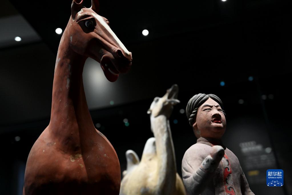 這是陜西考古博物館展出的唐代彩繪陶牽馬俑及馬(4月28日攝)。新華社記者 李一博 攝