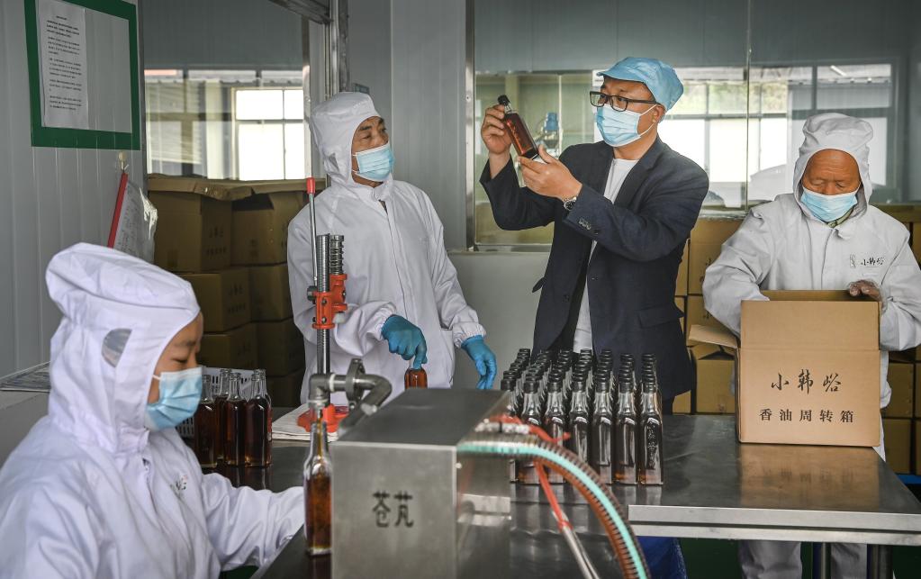 小韓峪村第一書記馮德全(右二)在小韓峪村小磨香油廠檢測(cè)香油品質(zhì)。新華社記者陶明 攝