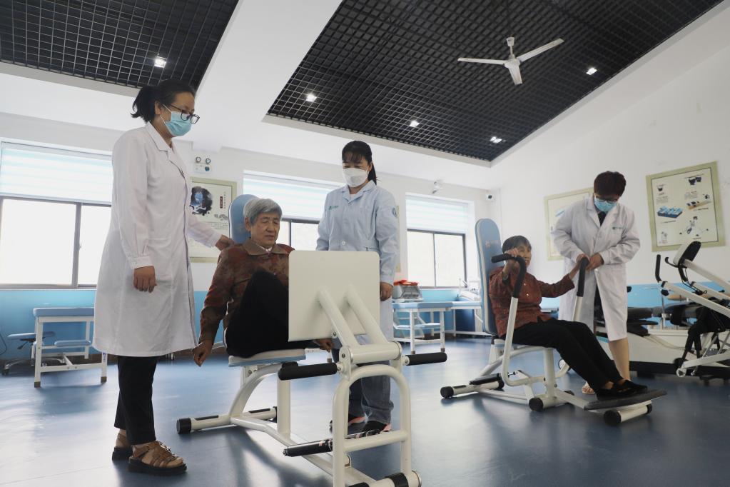 5月27日,在山東省博興縣呂藝鎮(zhèn)老年公寓醫(yī)養(yǎng)康復中心,醫(yī)護人員指導農村老人利用專業(yè)器械進行康復鍛煉。(博興縣委宣傳部供圖)