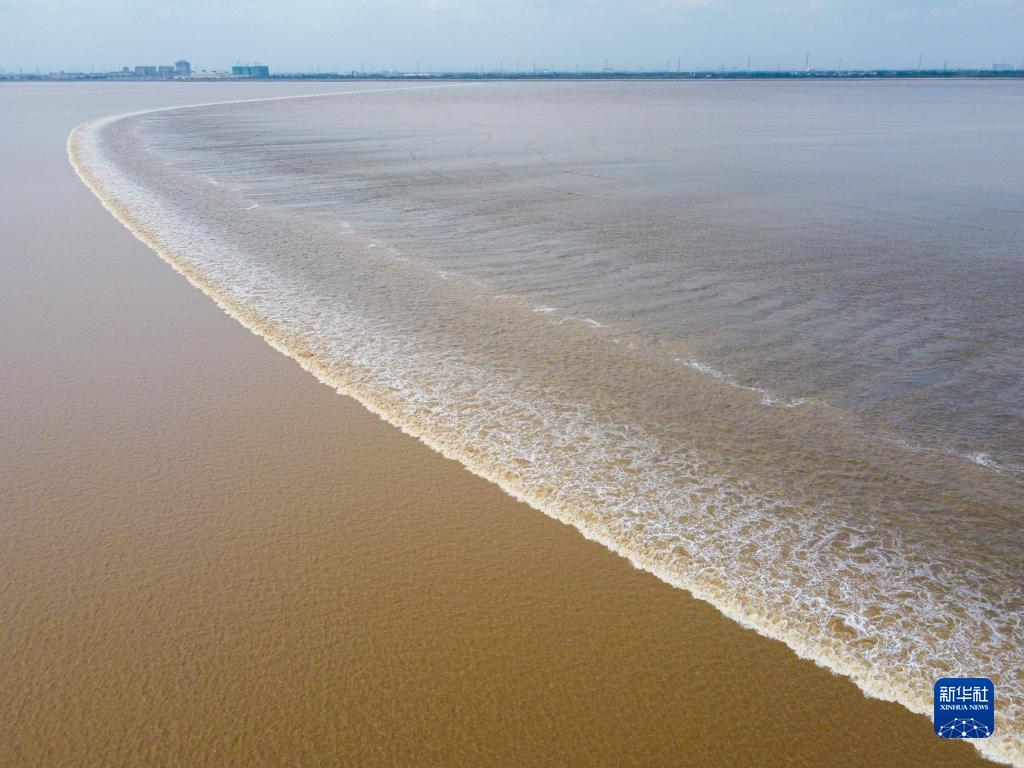 這是在杭州市錢(qián)塘新區(qū)拍攝的錢(qián)塘江一線潮奇觀(2020年10月5日攝,無(wú)人機(jī)照片)。新華社記者 江漢 攝