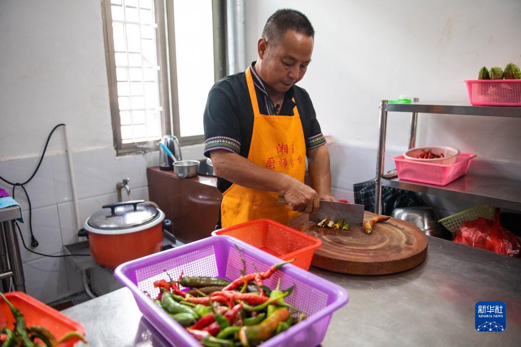 2020年9月17日,在汝城縣沙洲瑤族村,朱小紅在自家開(kāi)的農(nóng)家樂(lè)廚房里切菜。新華社記者 陳思汗 攝