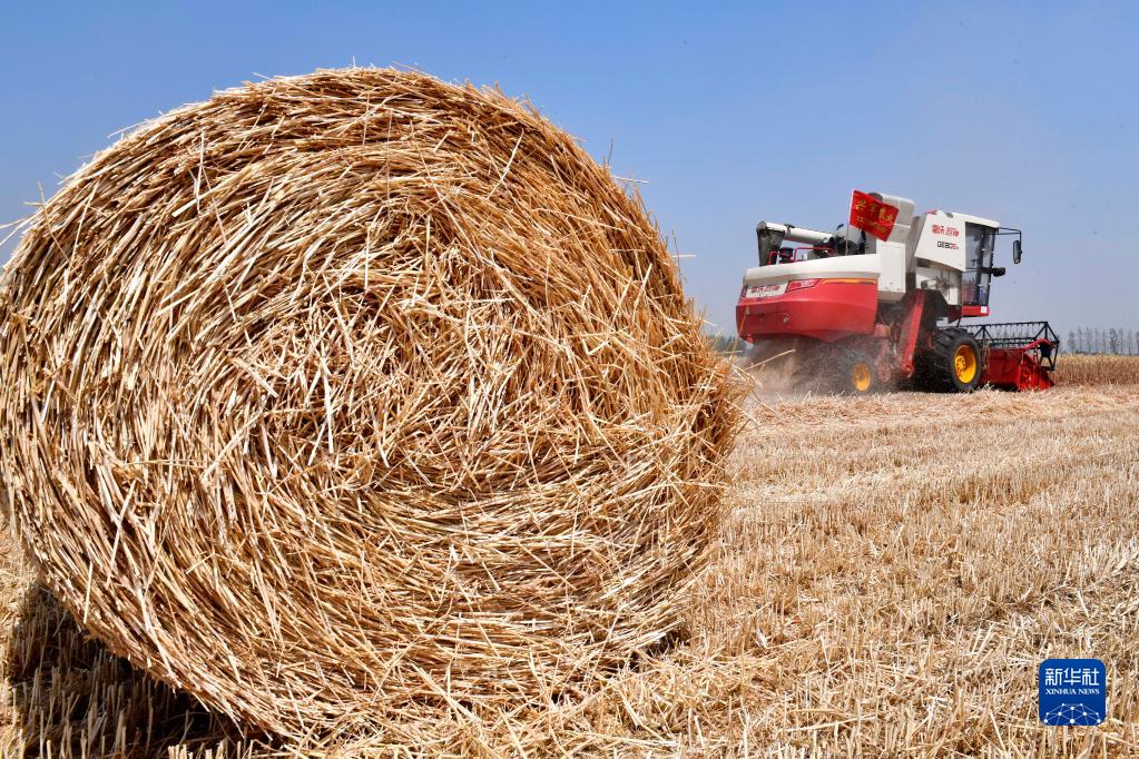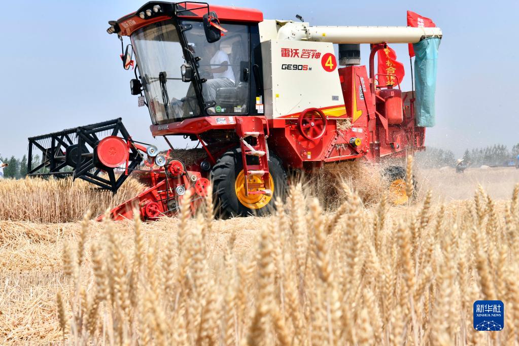 6月2日,在山東省郯城縣郯城街道,農(nóng)民駕駛農(nóng)機(jī)收獲小麥。新華社記者 郭緒雷 攝