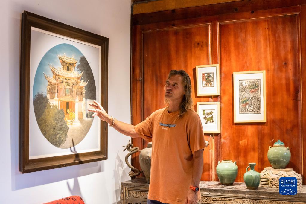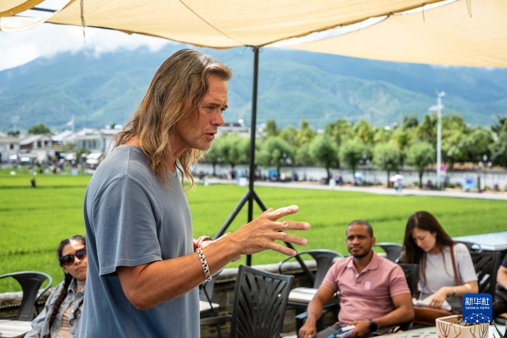 8月27日,林登在喜洲古鎮(zhèn)喜林苑向外國(guó)訪客介紹當(dāng)?shù)匚幕P氯A社記者 曹夢(mèng)瑤 攝