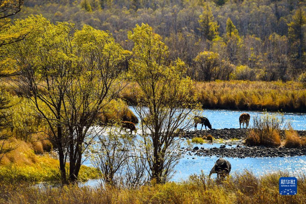 9月21日,牛群在阿爾山國家森林公園內(nèi)的河岸邊覓食。新華社記者 彭源 攝