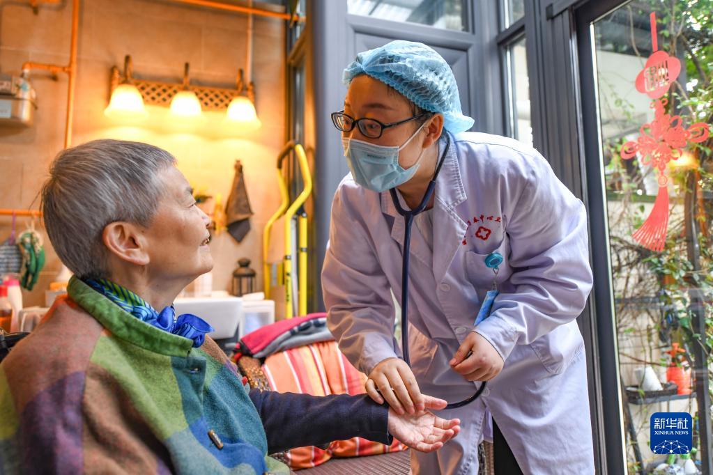 在四川省成都市溫江區(qū)萬(wàn)春鎮(zhèn)天鄉(xiāng)路社區(qū)居民家中,家庭醫(yī)生楊靜(右)在詢問(wèn)居民葉茂群近期的身體情況(2022年5月18日攝)。新華社記者 王曦 攝