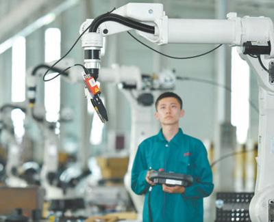 河北省任丘市通過搭建科技創(chuàng)新平臺,建設(shè)研發(fā)中心、技術(shù)研究院,持續(xù)深化產(chǎn)學(xué)研合作交流,推動企業(yè)轉(zhuǎn)型升級。圖為工作人員在生產(chǎn)車間調(diào)試機(jī)器人。 |