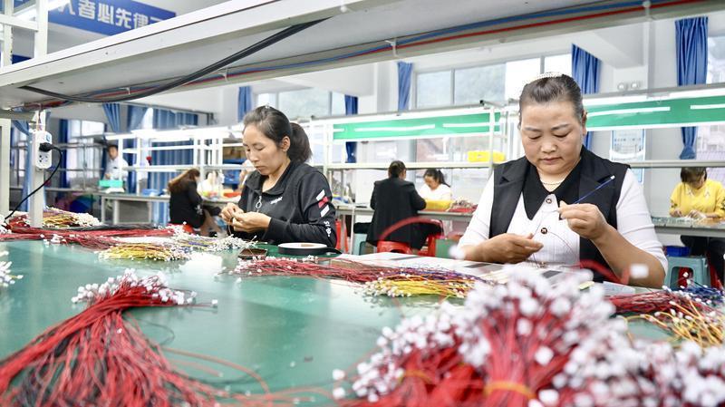 9月27日,在安康市漢濱區(qū)譚壩鎮(zhèn)松壩社區(qū)工廠,工人正在操作設(shè)備進(jìn)行電子線束生產(chǎn)作業(yè)。記者 孟珂攝