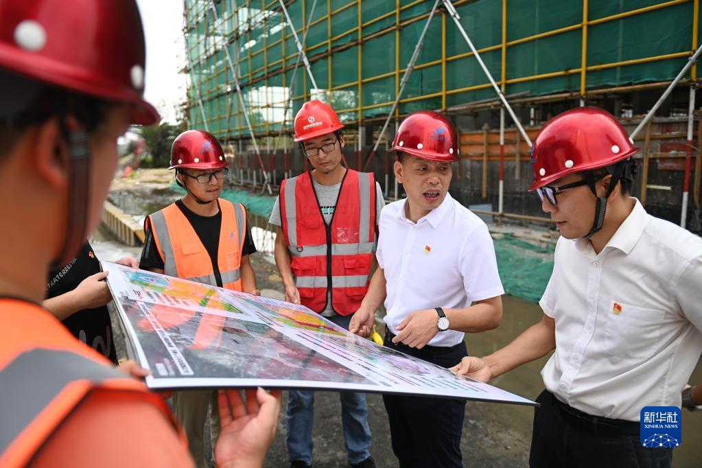 在浙江省寧波市奉化區(qū)蕭王廟街道滕頭村,二十大代表、滕頭村黨委書(shū)記、村委會(huì)主任傅平均(右二)在村黨群服務(wù)中心大樓建設(shè)工地察看施工進(jìn)展(2022年9月16日攝)。新華社記者 黃宗治 攝
