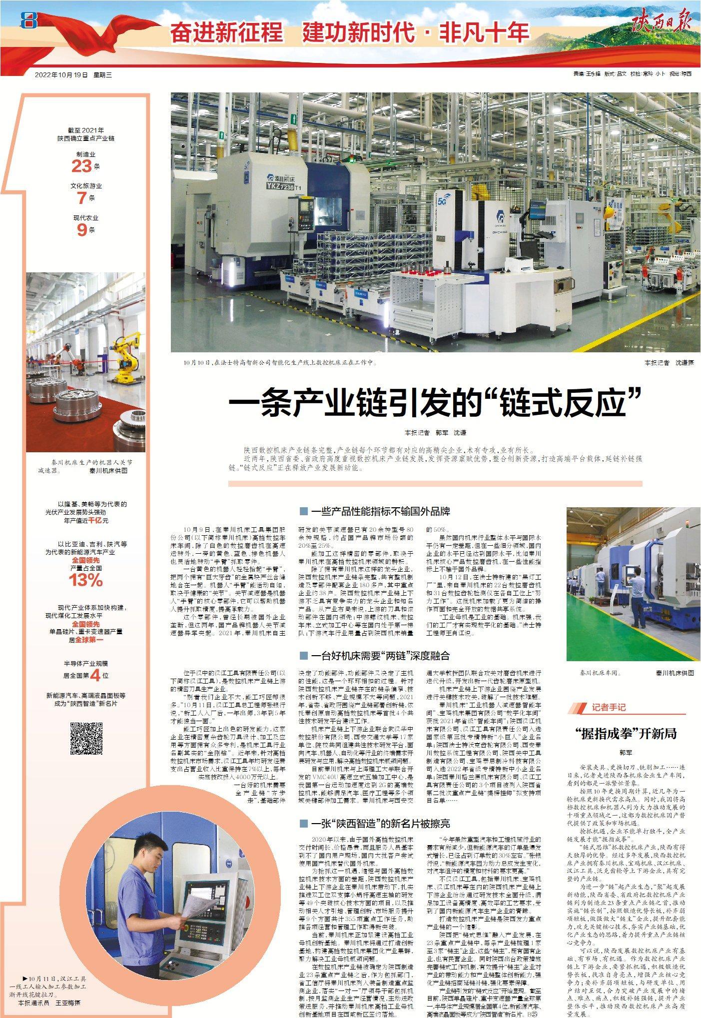 近兩年,陜西省委、省政府高度重視數(shù)控機(jī)床產(chǎn)業(yè)鏈發(fā)展,發(fā)揮資源稟賦優(yōu)勢(shì),整合創(chuàng)新資源,打造高端平臺(tái)載體,延鏈補(bǔ)鏈強(qiáng)鏈。“鏈?zhǔn)椒磻?yīng)”正在釋放產(chǎn)業(yè)發(fā)展新動(dòng)能。