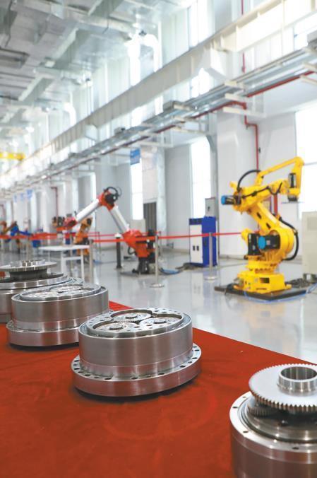 一臺(tái)黃色的機(jī)器人輕輕抬起“手臂”,把兩個(gè)擁有“巨大牙齒”的金屬塊嚴(yán)絲合縫地合在一起。機(jī)器人“手臂”能活動(dòng)自如,取決于健康的“關(guān)節(jié)”。關(guān)節(jié)減速器是機(jī)器人“手臂”的核心零部件,它可以幫助機(jī)器人提升抓取精度,提高承載力。
