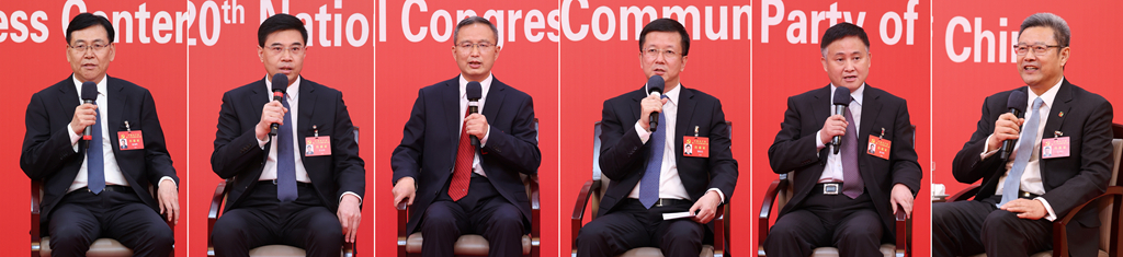 10月20日,中國共產(chǎn)黨第二十次全國代表大會新聞中心舉行集體采訪。青海、寧夏、新疆、中央和國家機關、中央金融系統(tǒng)、中央企業(yè)系統(tǒng)(在京)代表團新聞發(fā)言人出席,介紹代表團學習討論二十大報告情況,并回答記者提問(拼版照片)。新華社記者 張玉薇 攝