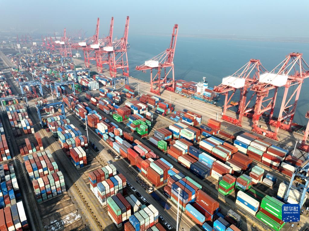 12月7日拍攝的江蘇連云港港集裝箱碼頭裝卸作業(yè)區(qū)(無(wú)人機(jī)照片)。新華社發(fā)(王春 攝)