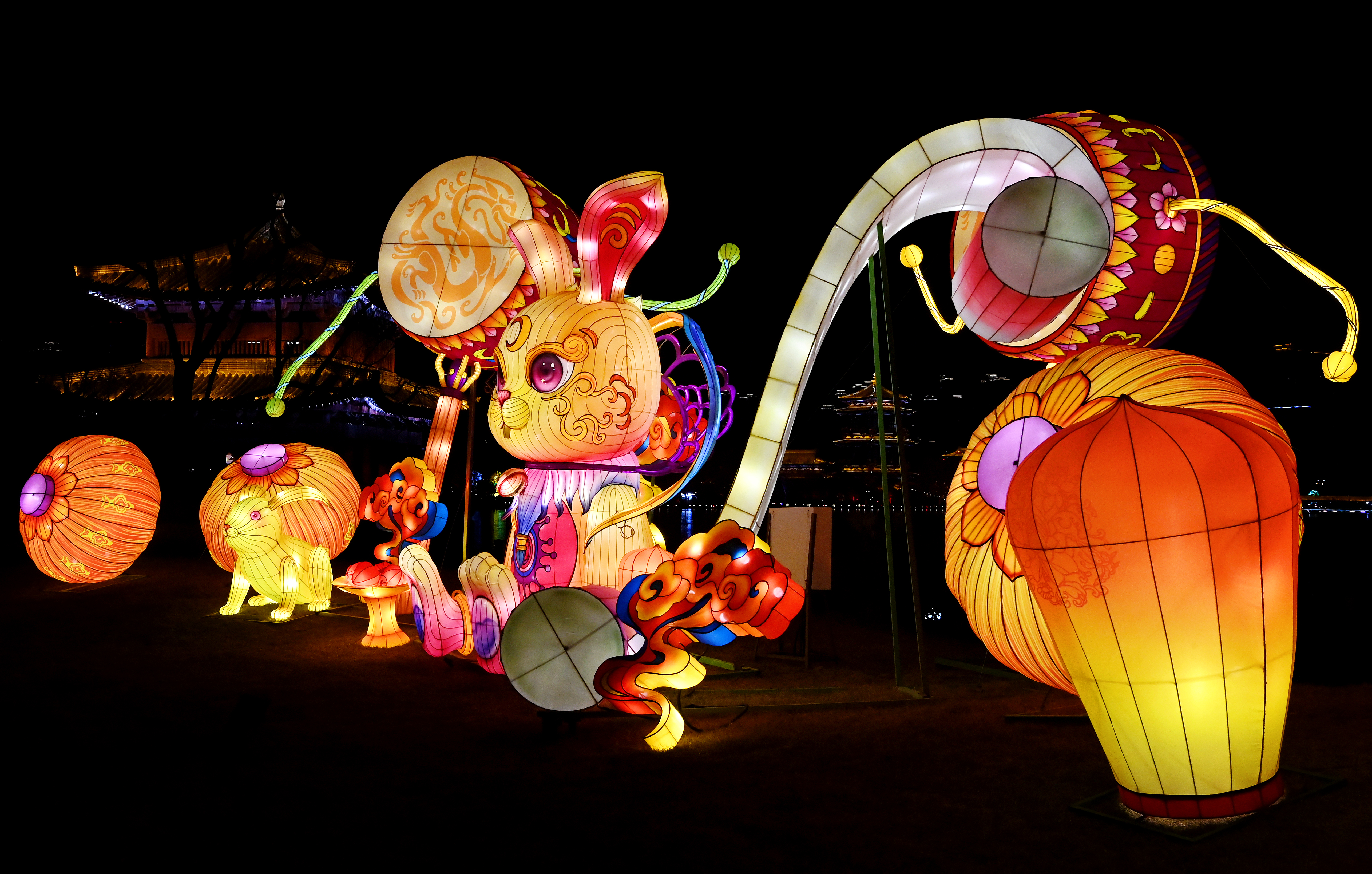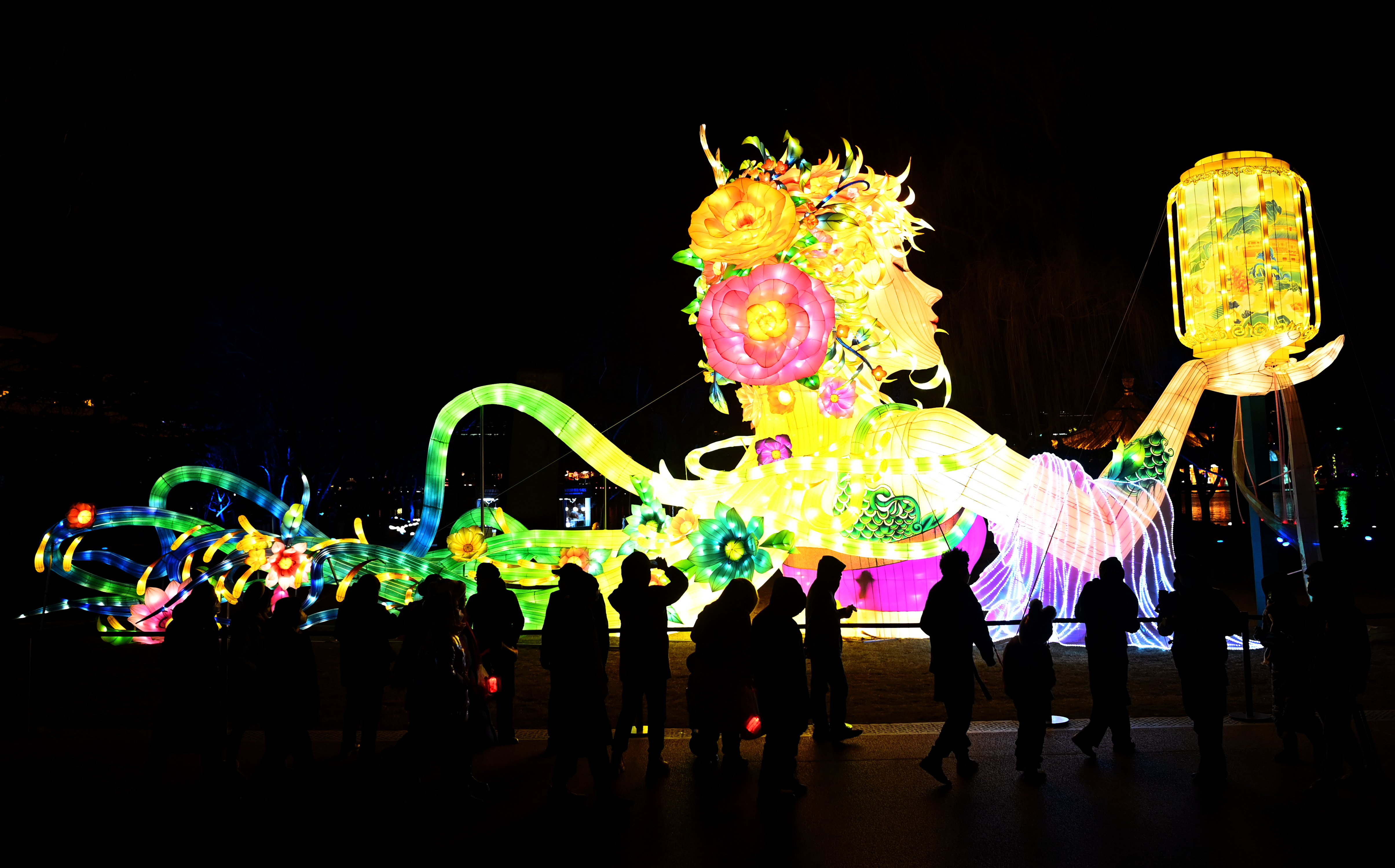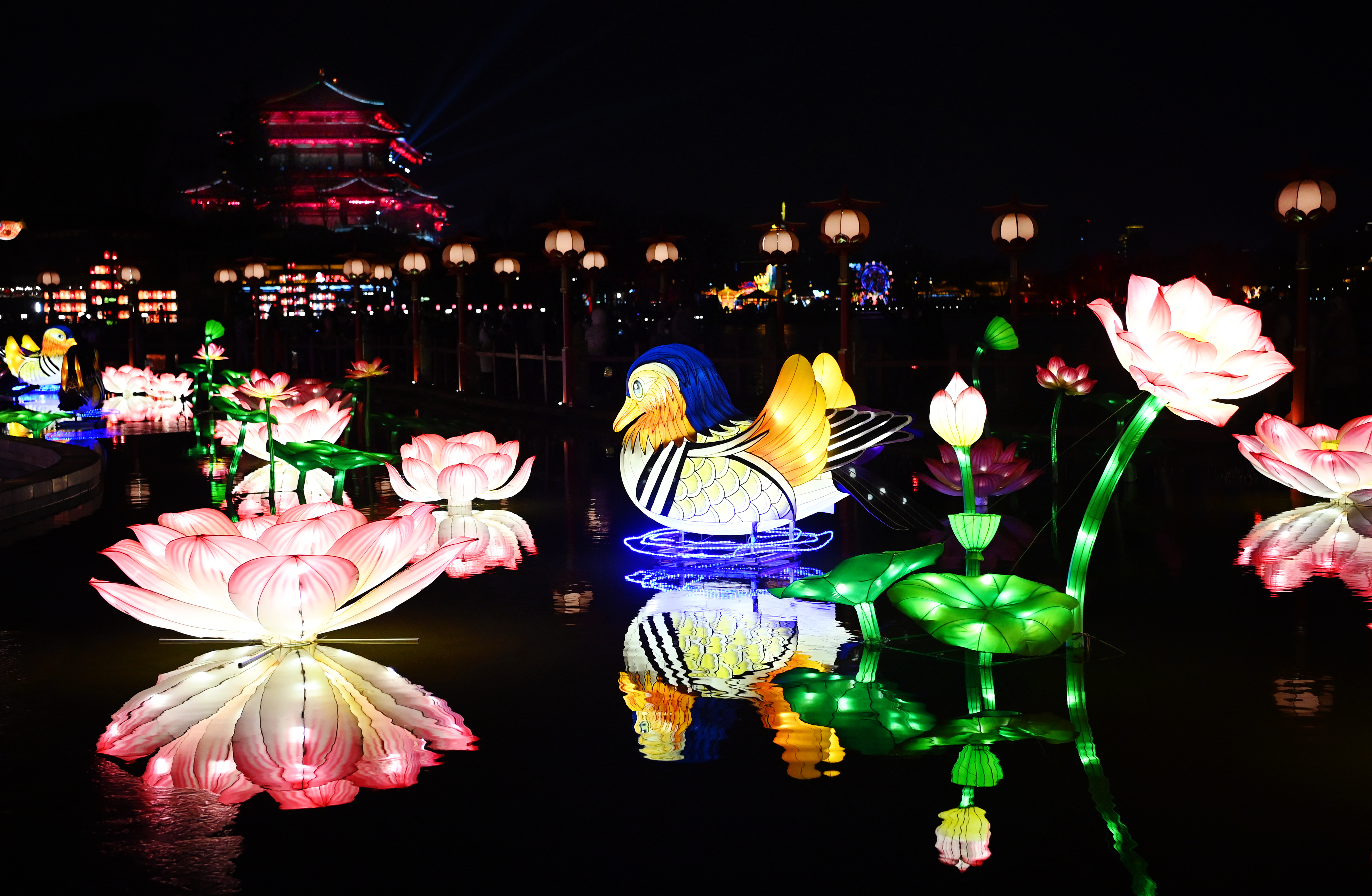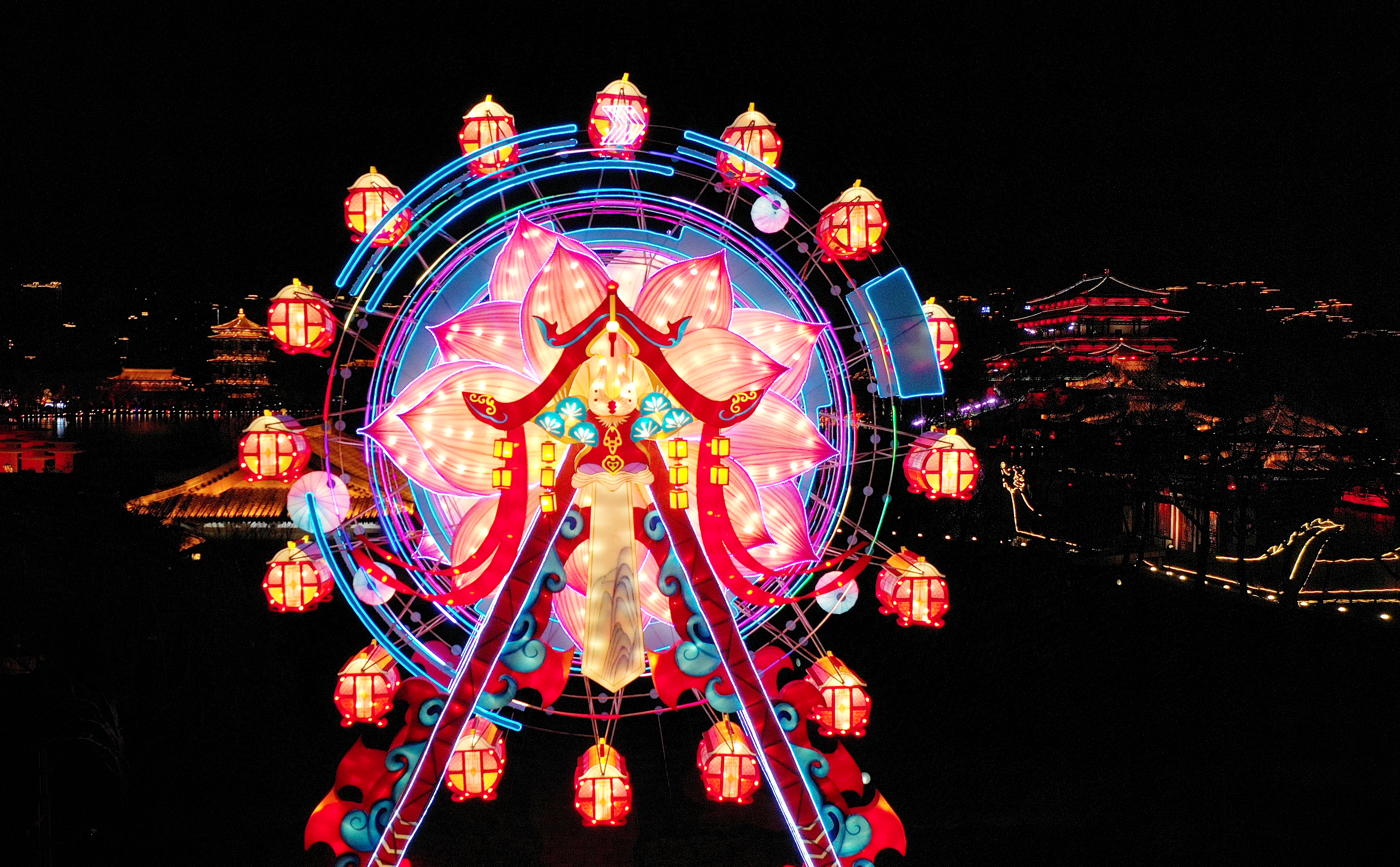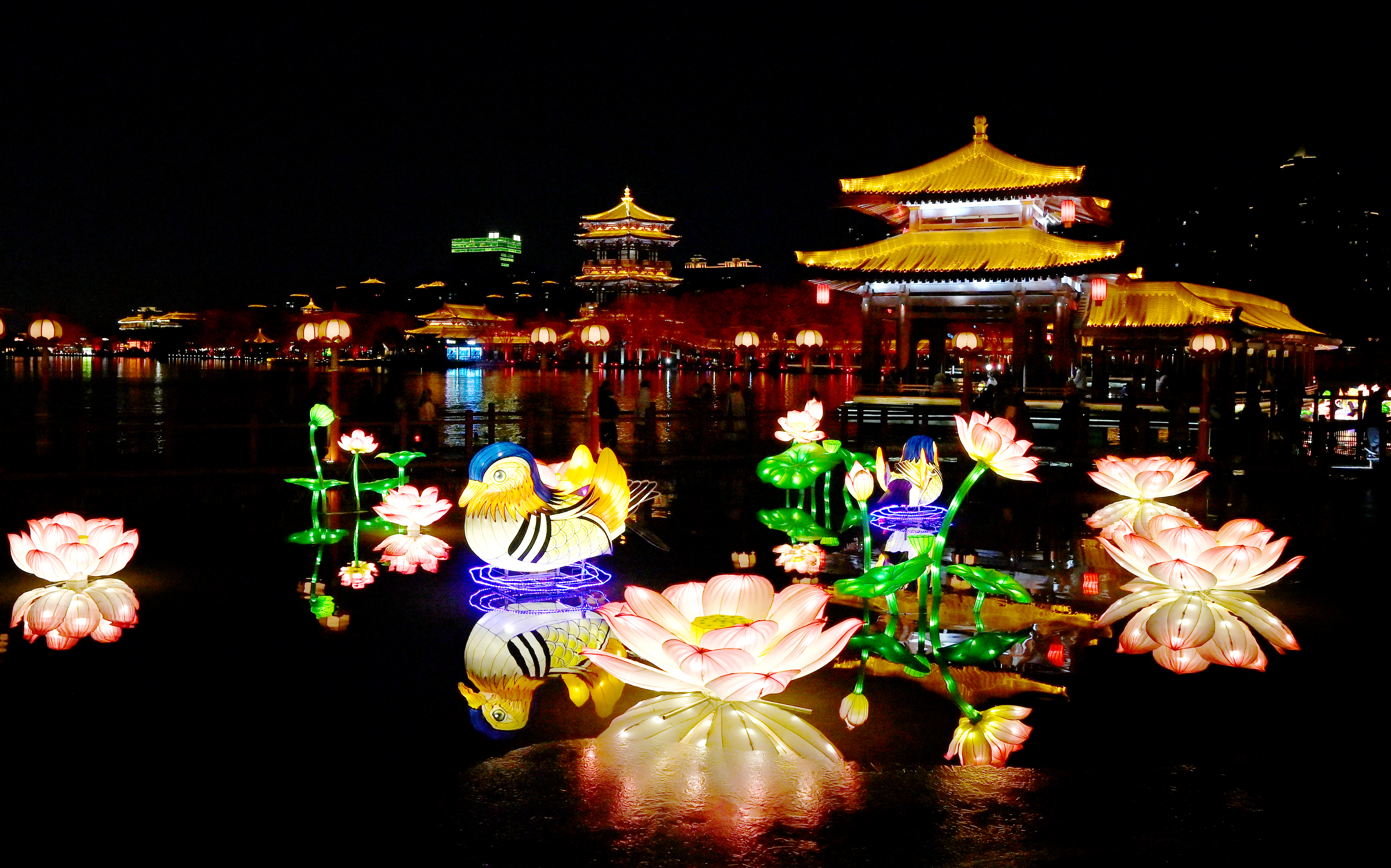 夜幕降臨,西安大唐芙蓉園內(nèi)萬盞花燈璀璨綻放,在仿唐式園林的亭臺樓閣、廊橋水波之間,燈與景交相輝映,美輪美奐。