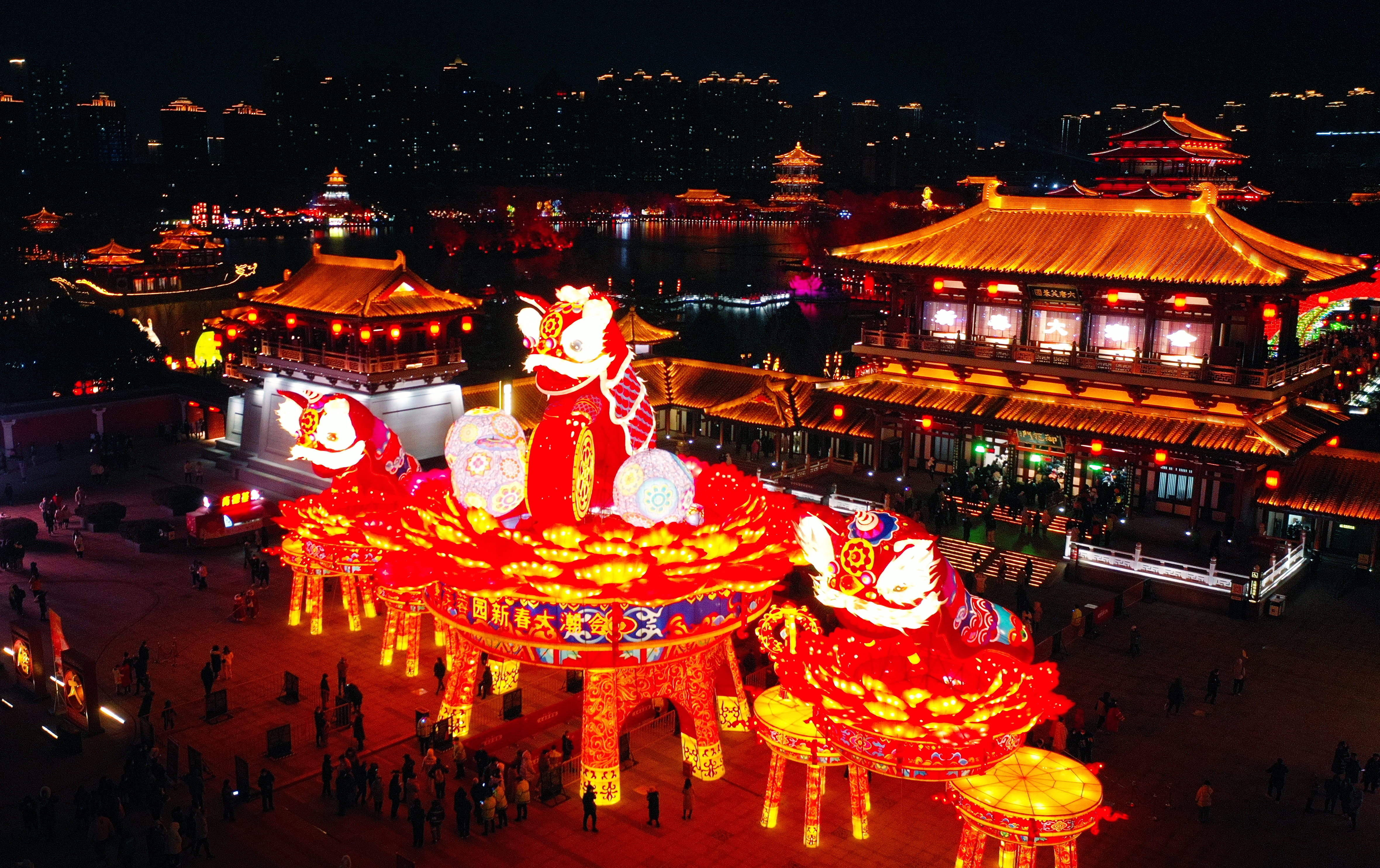 1月24日,游人在西安大唐芙蓉園內(nèi)觀賞花燈(無人機照片)。新華社記者 劉瀟 攝