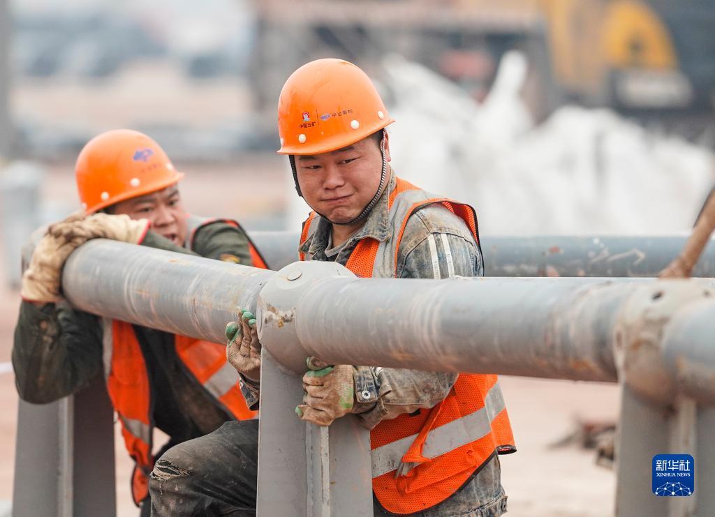 工人在重慶兩江新區(qū)新能源汽車產(chǎn)業(yè)園基礎(chǔ)設(shè)施配套項目現(xiàn)場進行鋼結(jié)構(gòu)材料拼裝作業(yè)(1月23日攝)。新華社記者 劉潺 攝
