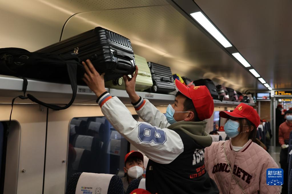1月30日,旅客在D2879次務(wù)工專列上放行李。這是2023年貴陽開出的首趟高鐵務(wù)工專列。新華社記者 劉續(xù) 攝