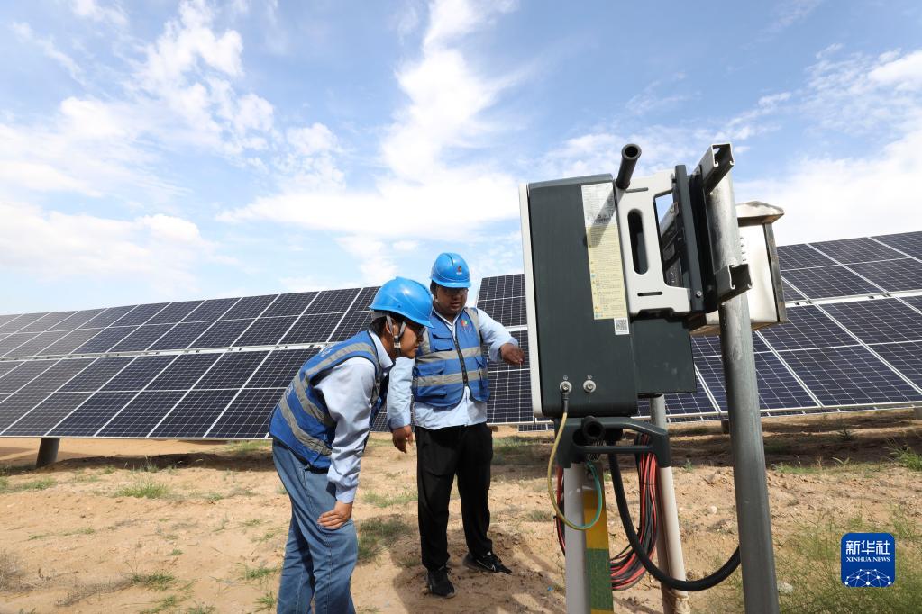 國家電投五凌電力余丁光伏電站職工在檢修設備(2022年8月31日攝)。新華社記者 盧鷹 攝