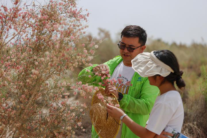 2023年6月12日,在中科院新疆生態(tài)與地理研究所策勒沙漠研究站天然試驗(yàn)區(qū),買爾當(dāng)和學(xué)生查看沙拐棗生長情況。新華社記者 郝昭 攝