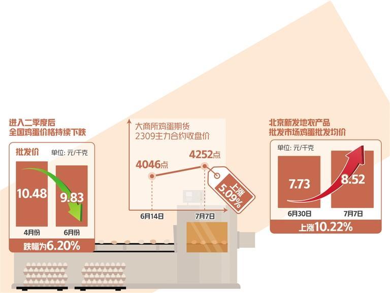 7月7日,大商所雞蛋期貨2309主力合約以4252點報收,比6月14日收盤4046點上漲5.09%。一些地方雞蛋現(xiàn)貨價格也顯著反彈。7日,北京新發(fā)地農產(chǎn)品批發(fā)市場雞蛋批發(fā)均價為8.52元/千克,比上周同期(6月30日)的7.73元/千克上漲10.22%。“本周蛋價快速反彈不具有可持續(xù)性,僅是正常波動。當前雞蛋供應仍然充足,沒有出現(xiàn)供不應求的狀況。”北京新發(fā)地農產(chǎn)品批發(fā)市場統(tǒng)計部經(jīng)理劉通介紹。
