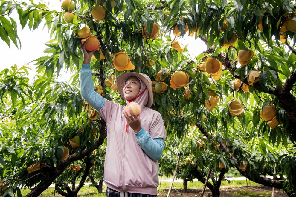 盛夏時節(jié),江蘇省無錫市惠山區(qū)陽山鎮(zhèn)的空氣中彌漫著香甜的味道。凌晨4點(diǎn),桃源村村民姚文君已在果園開始一天的忙碌。暑氣蒸騰,老姚的汗衫濕了又干、干了再濕。