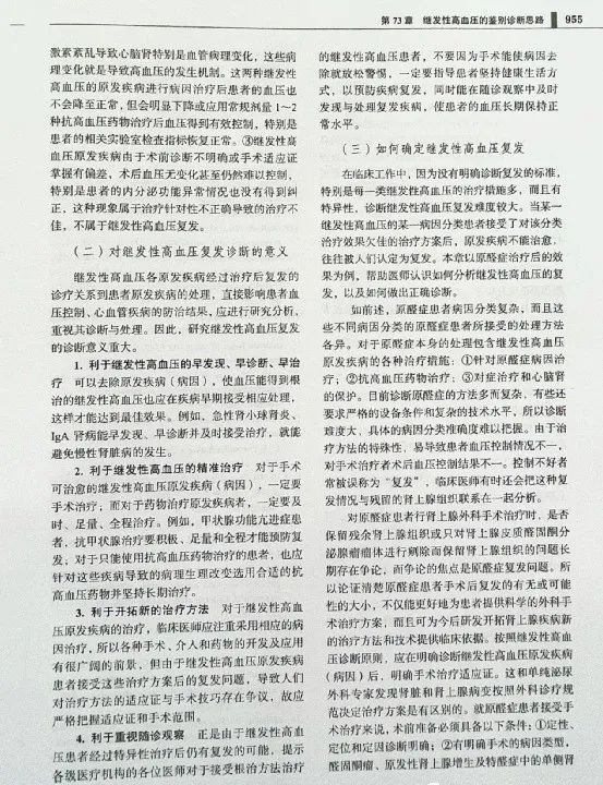 本書提出了繼發(fā)性高血壓復(fù)發(fā)的概念:繼發(fā)性高血壓在接受有效處理方法后達(dá)到了治愈效果者,在某種誘因作用下,再次出現(xiàn)該疾病病理與病理生理改變及由此產(chǎn)生臨床表現(xiàn)和相關(guān)實(shí)驗(yàn)室檢查結(jié)果異常,這就表明繼發(fā)性高血壓復(fù)發(fā)。讓人們清晰地認(rèn)識(shí)到對(duì)于繼發(fā)性高血壓復(fù)發(fā)診斷的意義:①利于繼發(fā)性高血壓的早發(fā)現(xiàn)、早診斷、早治療;②利于繼發(fā)性高血壓的精準(zhǔn)治療;③利于認(rèn)識(shí)和評(píng)價(jià)新的診療方法開拓的價(jià)值和意義;④利于重視繼發(fā)性高血壓患者的隨診觀察。