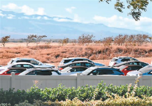 8月24日,美國(guó)夏威夷毛伊島卡胡盧伊機(jī)場(chǎng)外的一片空地上停放著租車(chē)公司沒(méi)有租出去的汽車(chē)。