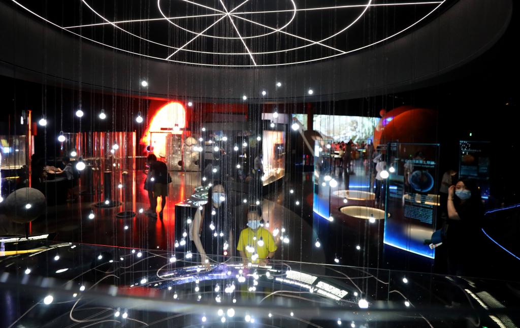參觀者在上海天文館“家園”展區(qū)內(nèi)一個名為“太陽的鄰居”的裝置展品前駐足觀看。新華社記者 方喆 攝