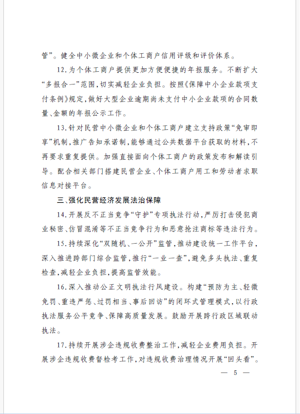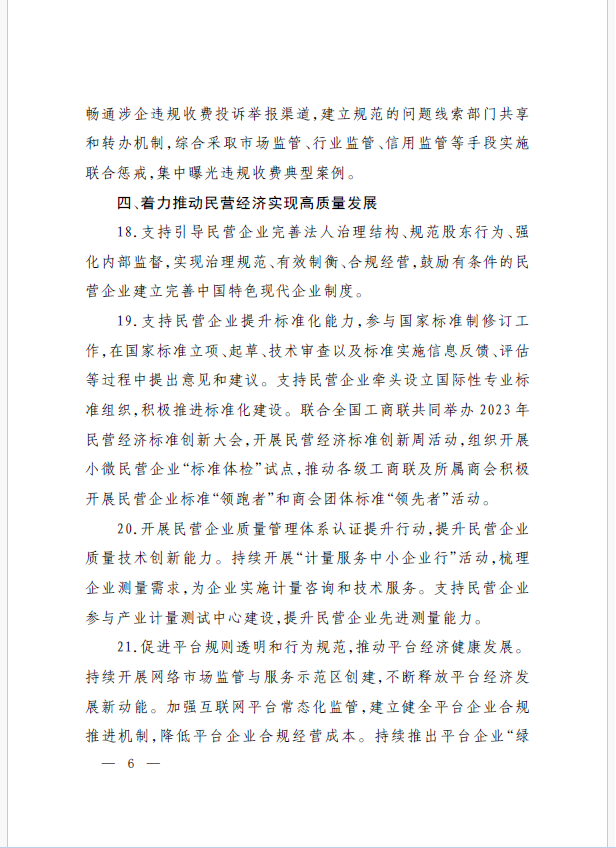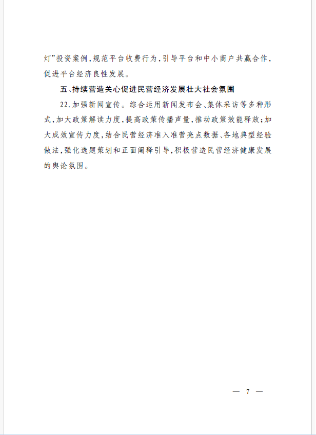 22條舉措聚焦五個方面,落實(shí)《意見》部署要求,回應(yīng)了民營經(jīng)濟(jì)各類關(guān)切:一是持續(xù)優(yōu)化民營經(jīng)濟(jì)發(fā)展環(huán)境。持續(xù)破除市場準(zhǔn)入壁壘,全面落實(shí)公平競爭政策制度,強(qiáng)化制止濫用行政權(quán)力排除、限制競爭的反壟斷執(zhí)法,完善社會信用激勵約束機(jī)制,健全失信行為糾正后的信用修復(fù)機(jī)制。二是加大對民營經(jīng)濟(jì)政策支持力度。完善信用信息歸集共享,健全中小微企業(yè)和個體工商戶信用評級和評價(jià)體系。完善支持政策直達(dá)快享機(jī)制。三是強(qiáng)化民營經(jīng)濟(jì)發(fā)展法治保障。持續(xù)完善知識產(chǎn)權(quán)保護(hù)體系,完善監(jiān)管執(zhí)法體系,杜絕選擇性執(zhí)法,健全涉企收費(fèi)長效監(jiān)管機(jī)制。四是著力推動民營經(jīng)濟(jì)實(shí)現(xiàn)高質(zhì)量發(fā)展。支持民營企業(yè)參與標(biāo)準(zhǔn)制定,計(jì)量服務(wù)中小企業(yè)。依法規(guī)范和引導(dǎo)民營資本健康發(fā)展,推動平臺經(jīng)濟(jì)健康發(fā)展。五是持續(xù)營造關(guān)心促進(jìn)民營經(jīng)濟(jì)發(fā)展壯大社會氛圍,及時推廣經(jīng)驗(yàn)做法,加大宣傳。