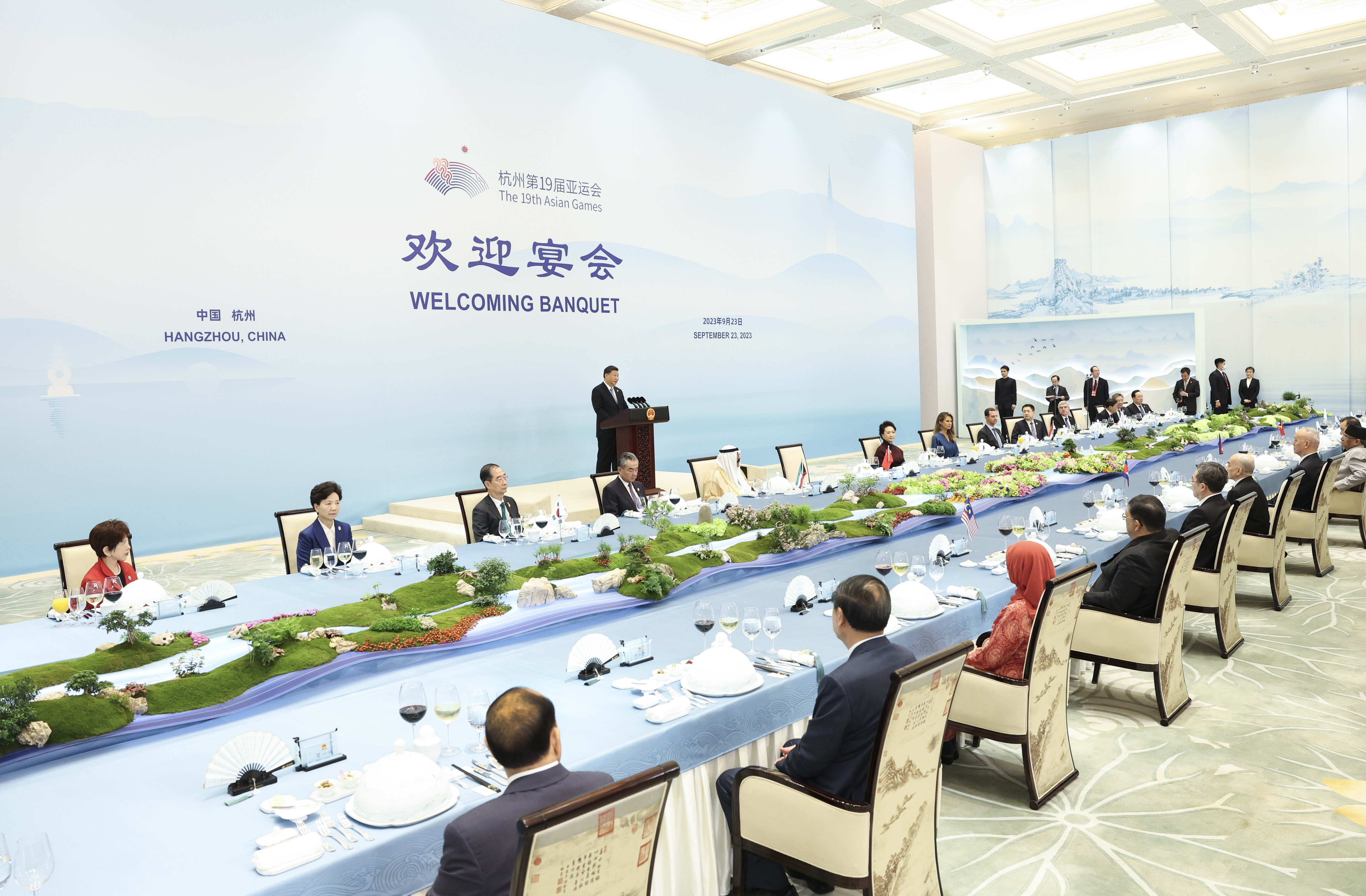 9月23日中午,國家主席習近平和夫人彭麗媛在浙江省杭州市西子賓館舉行宴會,歡迎來華出席杭州第19屆亞洲運動會開幕式的國際貴賓。