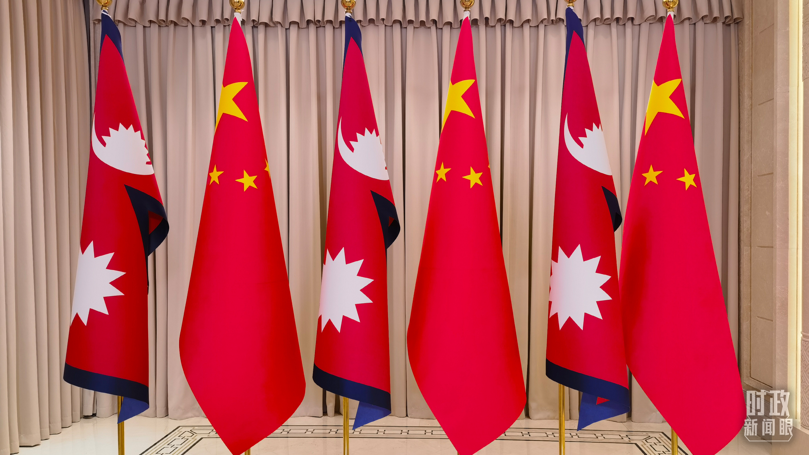 △會見現(xiàn)場擺放的中國、尼泊爾國旗。(總臺央視記者周志國拍攝)