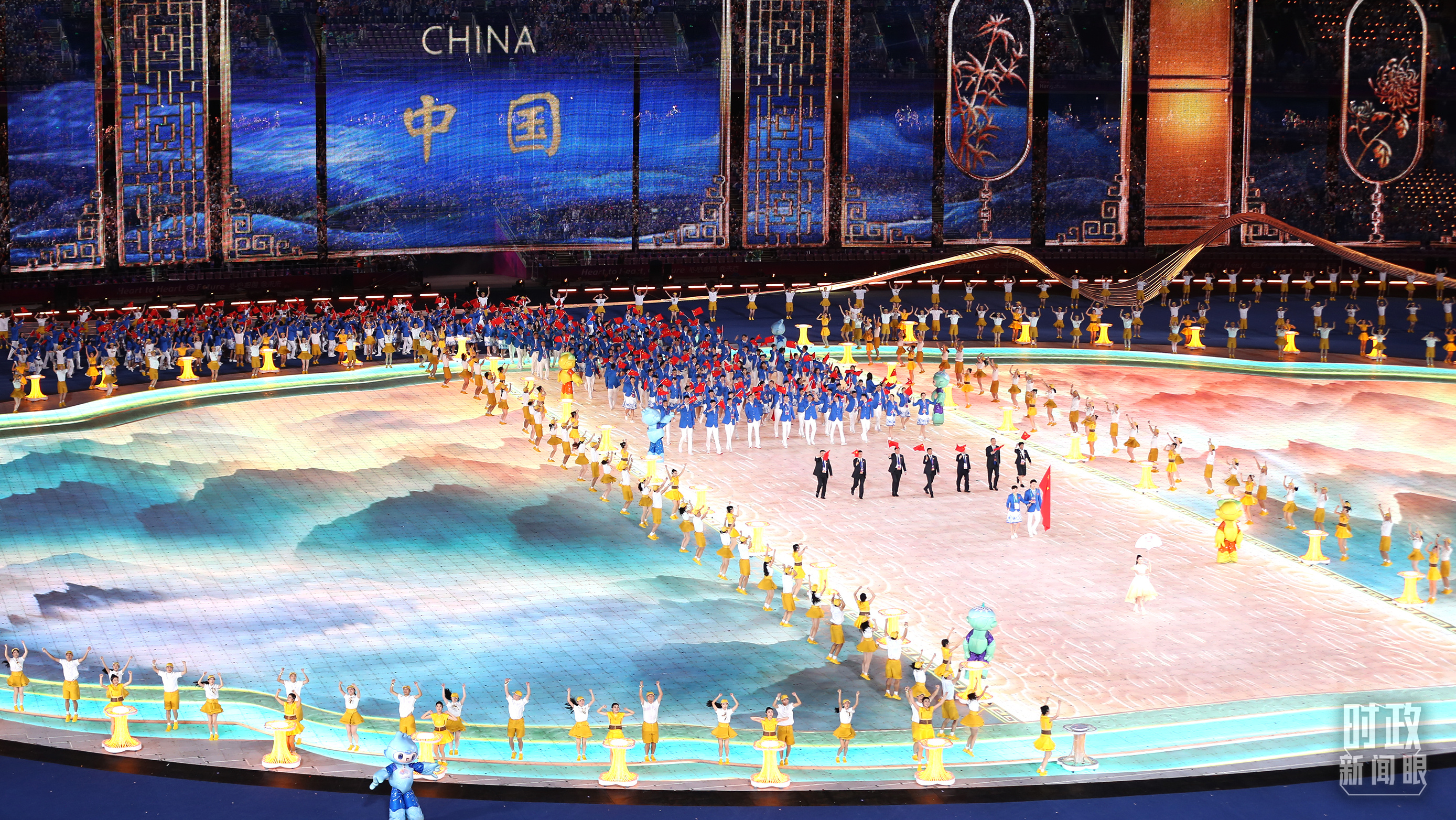 △開幕式文藝表演中的亞運(yùn)會吉祥物。(總臺央視記者魏幫軍拍攝)