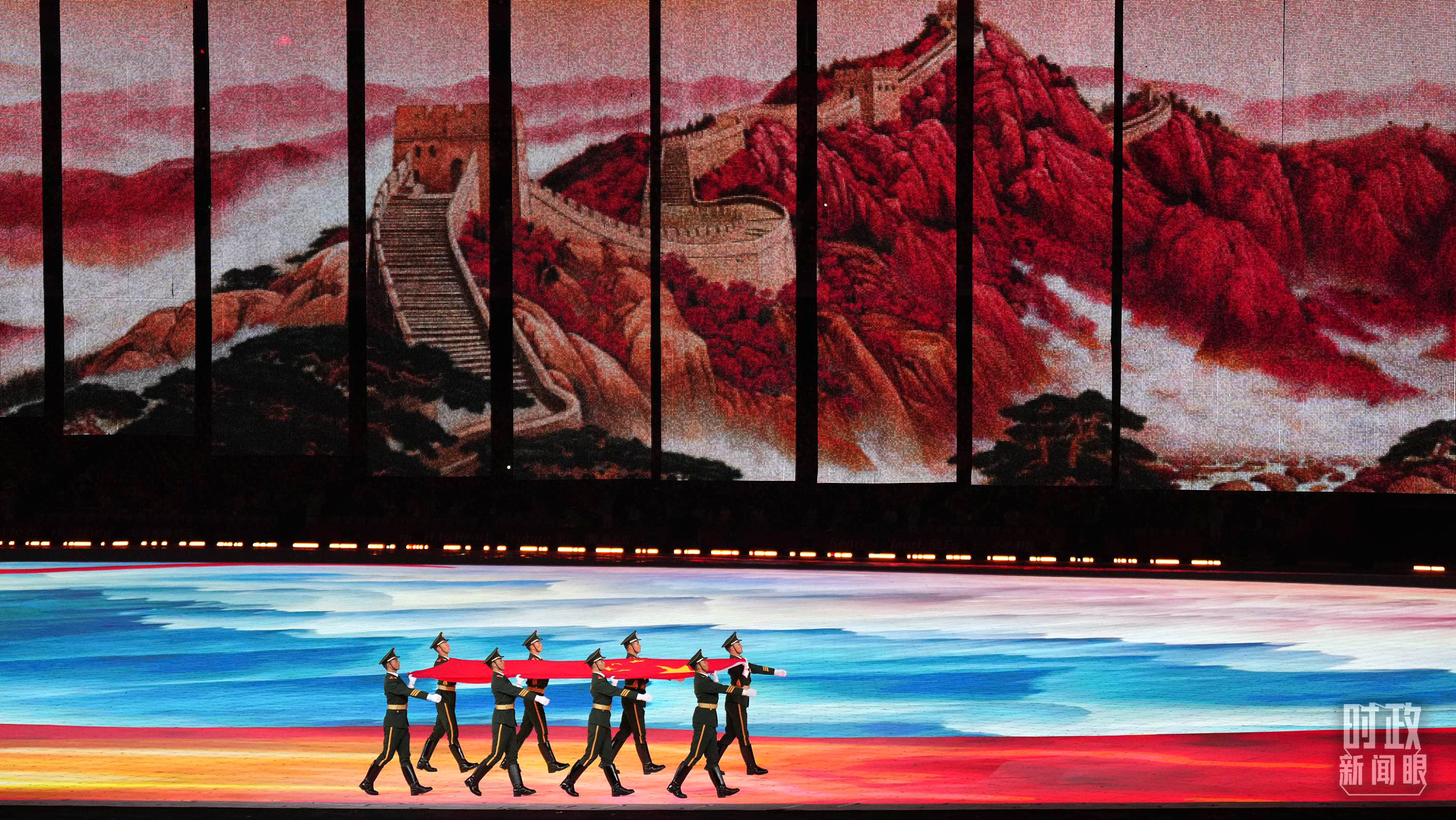 △踏著紅綢鋪就的道路,五星紅旗入場。(總臺央視記者魏幫軍、國廣記者李晉拍攝)