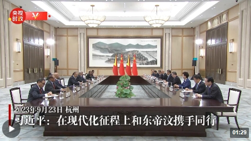 當(dāng)天,從上午到晚上,習(xí)近平主席在杭州會見多位亞洲國家領(lǐng)導(dǎo)人,為國際貴賓舉行歡迎宴會,并同他們共同出席杭州亞運(yùn)會開幕式。從習(xí)主席在會見和致辭時的重要講話,到別具特色的歡迎宴會、精彩紛呈的開幕式,都傳遞了豐富的信息?!稌r政新聞眼》為你解讀。