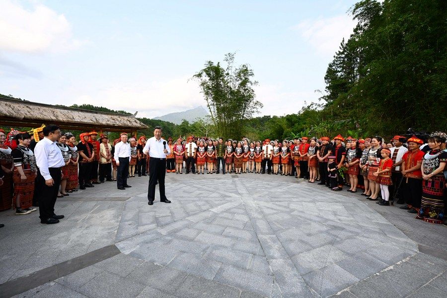 2022年4月11日下午,習近平在海南省五指山市水滿鄉(xiāng)毛納村同村民們親切交流。
