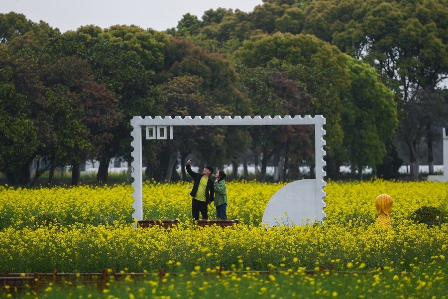 游客在浙江嘉興市秀洲區(qū)王店鎮(zhèn)鎮(zhèn)中村的“青青樂地”農耕文化園內游玩(2023年4月3日攝)。