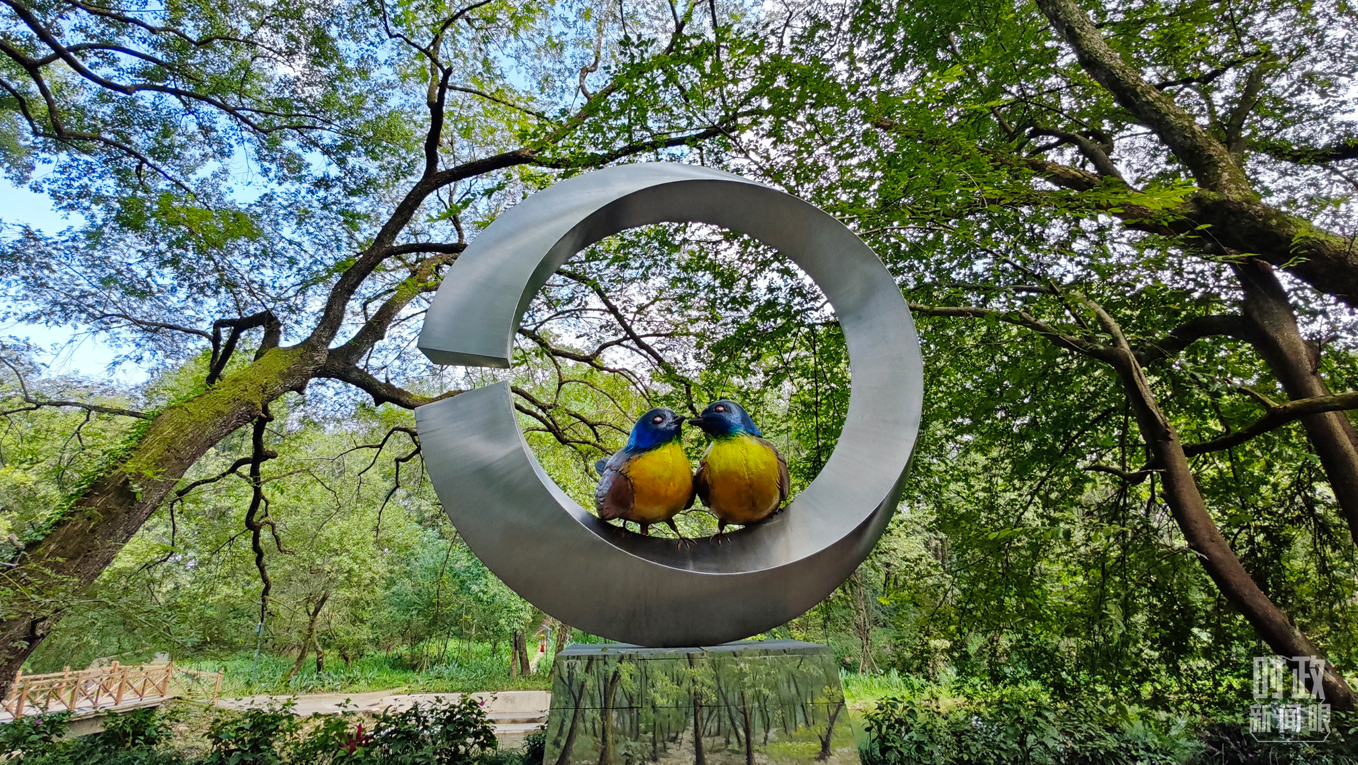 △石門村里的藍(lán)冠噪鹛雕像。(總臺(tái)央視記者許永松拍攝)