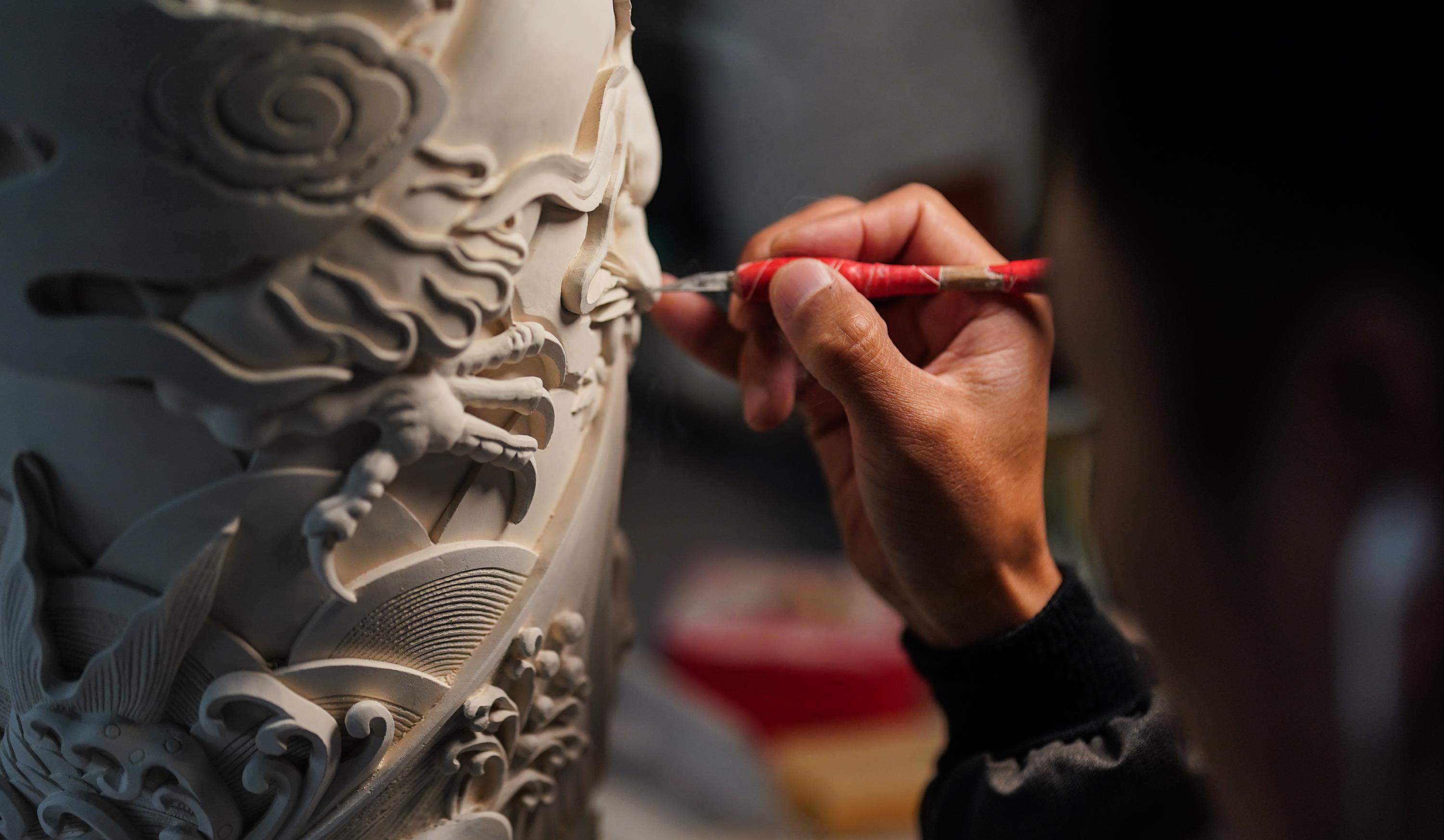 △景德鎮(zhèn)工匠在進行陶瓷雕刻。(總臺國廣記者李晉拍攝)
