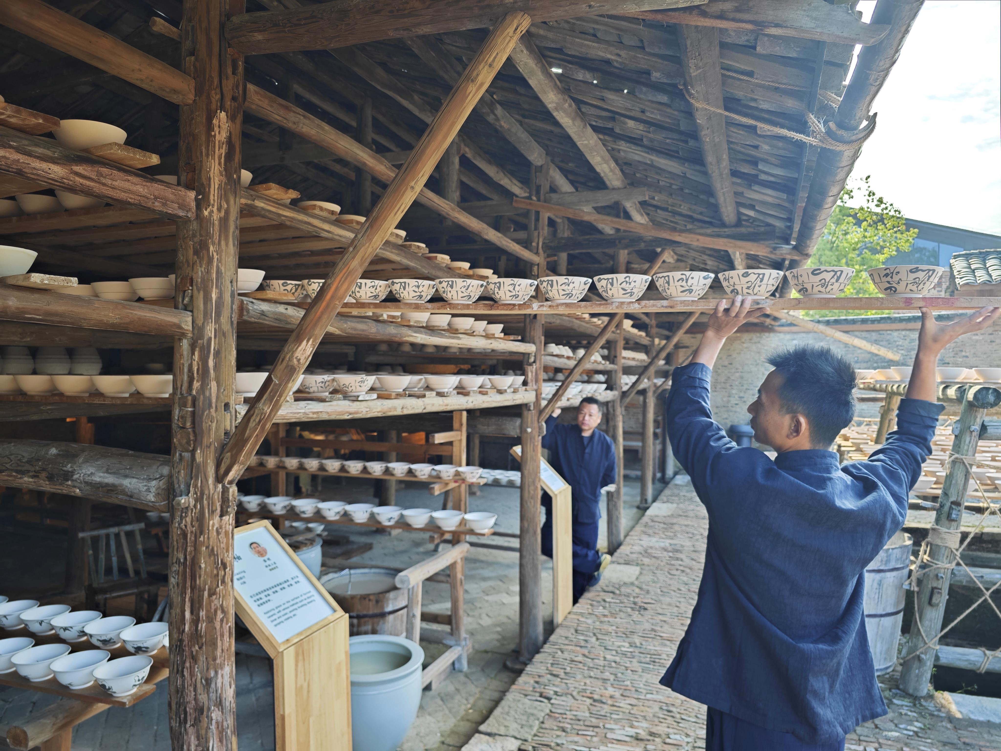 △陶陽里歷史文化街區(qū)里,工匠將陶瓷工藝品放到架上晾干。(總臺央視記者彭漢明拍攝)