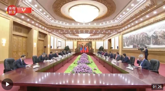 10月19日上午,國(guó)家主席習(xí)近平在人民大會(huì)堂會(huì)見來華出席第三屆“一帶一路”國(guó)際合作高峰論壇的蒙古國(guó)總統(tǒng)呼日勒蘇赫。