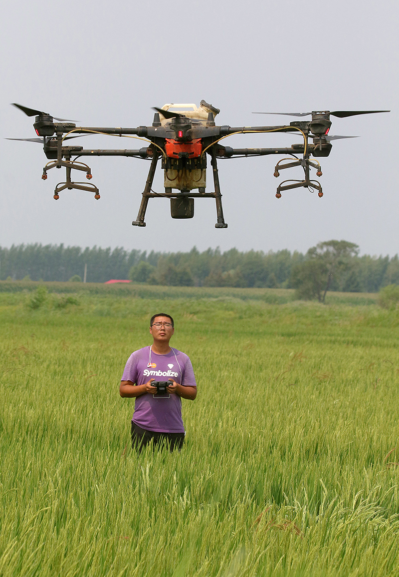 2021年7月27日,哈爾濱呼蘭區(qū)腰堡村的一片稻田間,忠萍農(nóng)作物種植專業(yè)合作社的“飛手”正在操縱無人機對水稻噴施葉面肥。