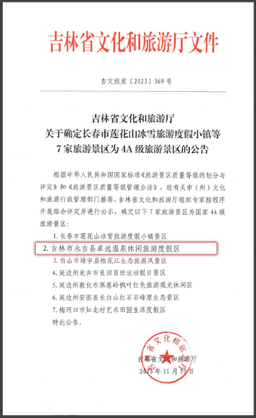 近日, 根據國家《旅游景區(qū)質量等級的劃分與評定》和《旅游景區(qū)質量等級管理辦法》,經相關部門推薦,吉林省文化和旅游廳組織專家按程序開展綜合評定并進行公示,確定金恪集團旗下吉林卓遠溫泉休閑旅游度假區(qū)等7家旅游景區(qū)成為國家4A級旅游景區(qū)。