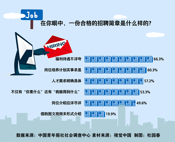 日前,中國青年報社社會調(diào)查中心聯(lián)合問卷網(wǎng)(wenjuan.com),對1334名應屆大學生進行的一項調(diào)查顯示,在他們眼中,一份合格的招聘簡章,首先是福利待遇不浮夸(66.3%),其次是崗位培養(yǎng)計劃實事求是(60.3%),再次是人才需求明確具體(57.2%)。