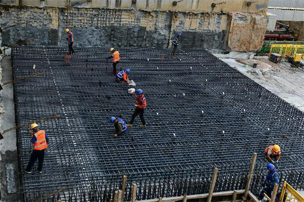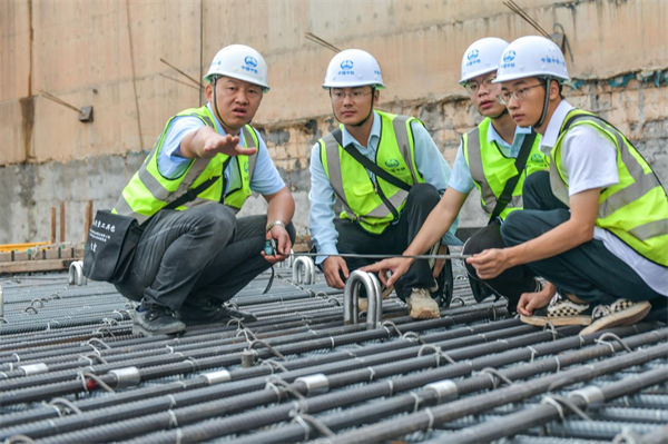 照此安排,項(xiàng)目部各部門、作業(yè)隊(duì)既各自為戰(zhàn),又協(xié)調(diào)統(tǒng)一,按區(qū)域、分專業(yè)、依先后齊頭并進(jìn)。筆者在地面施工區(qū)域看到,盾構(gòu)井臨時(shí)封堵板的鋼筋綁扎已經(jīng)完成,8名作業(yè)人員和監(jiān)理、技術(shù)人員在做最后的檢查,混凝土罐車、泵車嚴(yán)陣以待……不一會(huì)兒,混凝土順著管子就流向了鋼筋網(wǎng)內(nèi),4名振搗工也隨之開(kāi)始忙碌,嗡嗡聲響成一片。車站1號(hào)鋼筋場(chǎng),10幾名穿著印有“鋼筋工”“信號(hào)司索工”馬甲的工人,或協(xié)助吊車調(diào)運(yùn)鋼筋、或切割鋼筋原材下料;不遠(yuǎn)處,吊車調(diào)運(yùn)明挖段鋼支撐轉(zhuǎn)場(chǎng)……