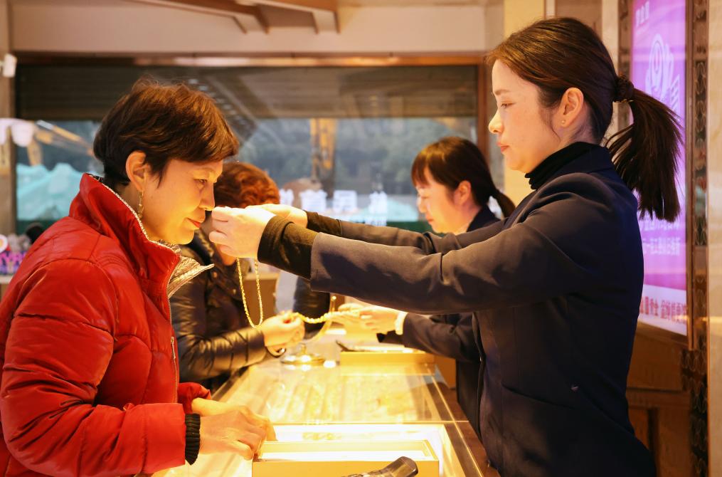 12月4日,在浙江省湖州市德清縣乾元鎮(zhèn)一家金店,顧客在挑選黃金首飾。(倪立芳 攝)