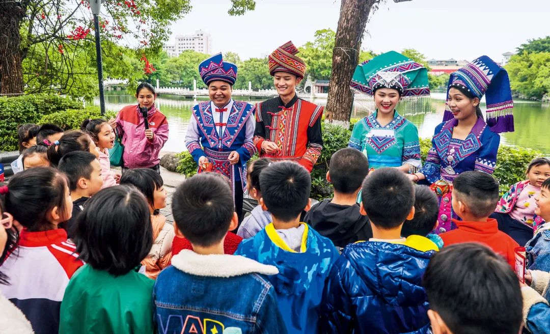 2023年4月25日,廣西桂林,“網(wǎng)絡(luò)法治宣傳一條街”在榕湖景區(qū)古南門“開街”,身穿民族服裝的工作人員演唱山歌向青少年普及網(wǎng)絡(luò)法治知識(shí)。