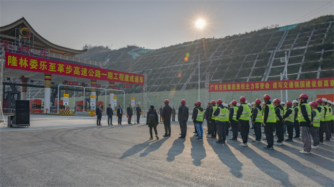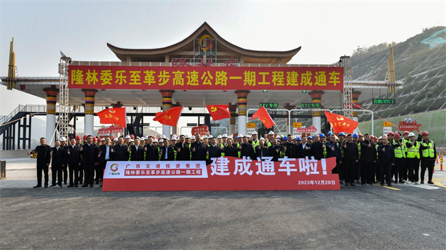 12月28日,在偉隆高速隆林東收費(fèi)站舉行的開(kāi)通儀式上,廣西交投總經(jīng)理劉鑫介紹項(xiàng)目情況,廣西百色市領(lǐng)導(dǎo)講話,廣西自治區(qū)交通運(yùn)輸廳黨組成員李德春講話并宣布隆林委樂(lè)至革步高速公路一期工程建成通車。