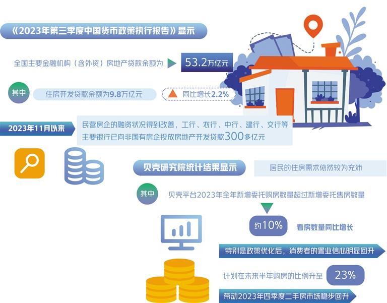 從銀行信貸角度看,房地產(chǎn)信貸融資的規(guī)模、結構整體穩(wěn)定?!?023年第三季度中國貨幣政策執(zhí)行報告》顯示,全國主要金融機構(含外資)房地產(chǎn)貸款余額為53.2萬億元,其中,住房開發(fā)貸款余額為9.8萬億元,同比增長2.2%。2023年11月以來,民營房企的融資狀況得到改善,工行、農(nóng)行、中行、建行、交行等主要銀行已向非國有房企投放房地產(chǎn)開發(fā)貸款300多億元。