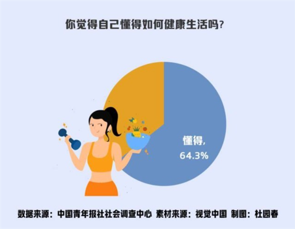 調(diào)查顯示,64.3%的受訪青年認(rèn)為自己懂健康生活,35.7%的受訪青年表示“不懂”。進(jìn)一步分析顯示,受訪青年所在城市級(jí)別越高,認(rèn)為自己懂健康生活的比例越高,一線城市受訪青年的比例最高,為71.6%;上班族認(rèn)為自己懂健康生活的比例(65.8%)略高于在校大學(xué)生(64.6%);隨著年齡的增長(zhǎng),受訪青年認(rèn)為自己懂健康生活的比例越高,受訪85后最高,為67.2%,00后相對(duì)最低,為61.2%。