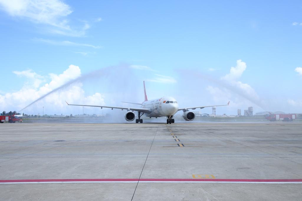 2023年1月18日,中國(guó)首都航空J(rèn)D455航班在馬爾代夫馬累維拉納國(guó)際機(jī)場(chǎng)接受水門禮。