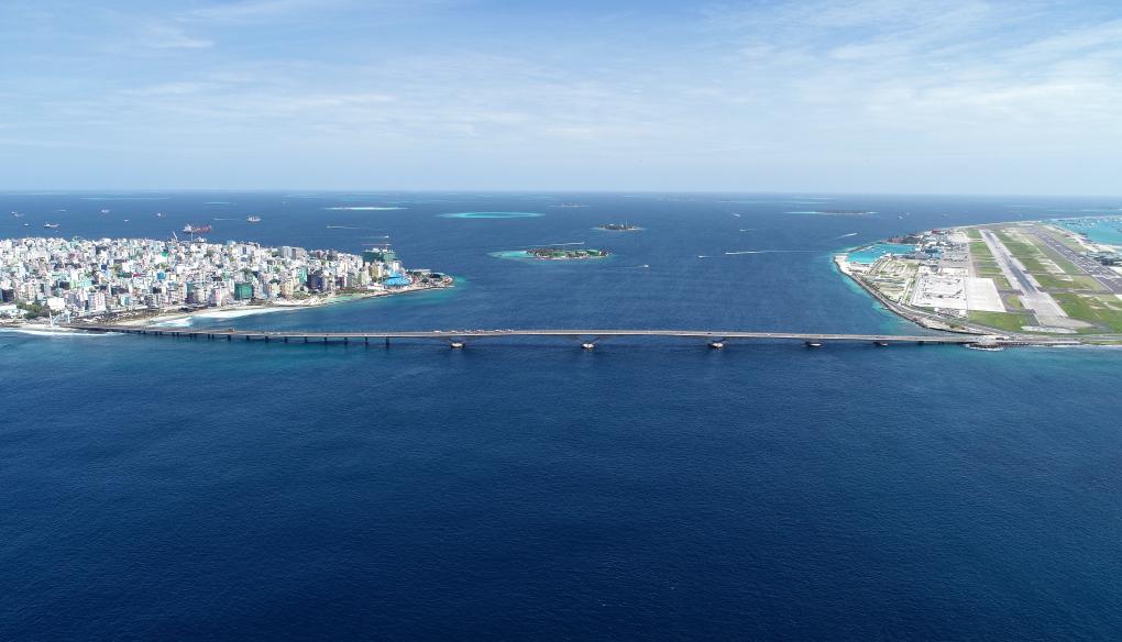 這是航拍的連接馬爾代夫首都馬累和機(jī)場(chǎng)島的中馬友誼大橋。